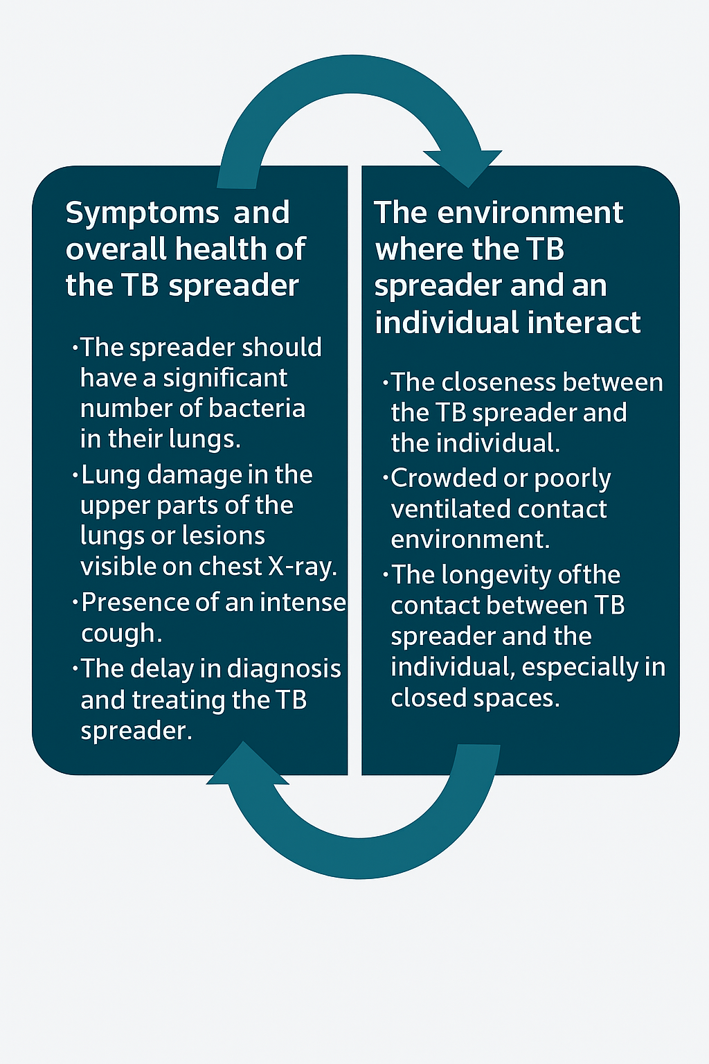 Therefore, the primary mode of contracting TB is through droplets from an infected individual. However, an individual cannot contract TB as easily as with a common cold (Long, Divangahi, and Schwartzman, 2022). There are additional factors that increase the likelihood and are primarily associated with the symptoms and overall health of the TB spreader (the infected individual), as well as with characteristics of the environment where the TB spreader and an individual interact, as shown in the graphic below.