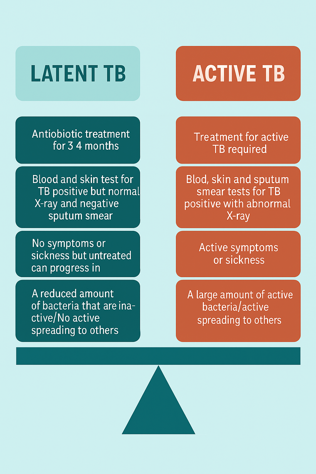 Another characteristic of TB that makes it challenging to identify and treat is its unusual bacterial behaviour, in which infection symptoms can pass unnoticed, delaying immediate treatment. Immediately after infection with TB, individuals can be active spreaders (active TB), with visible symptoms, or inactive/latent spreaders (latent TB), with no visible symptoms; therefore, infection is not spreadable (Price and Nguyen, 2024). The graphic below highlights the differences between active and latent TB.