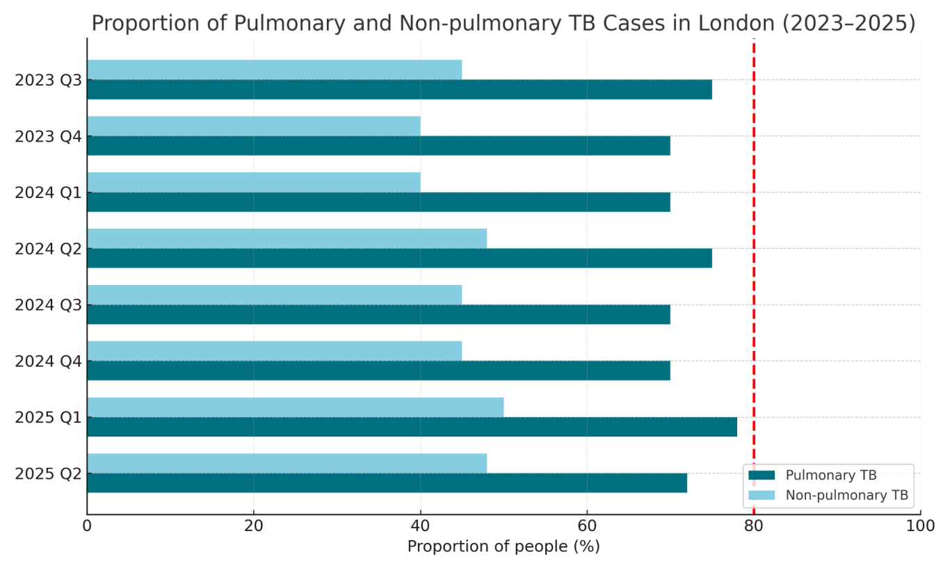 Figure 1. Proportion of culture confirmation among TB notifications in London by site of disease, over the 2 years (last 8 quarters) (Source: UK Health Security Agency, 2025a)